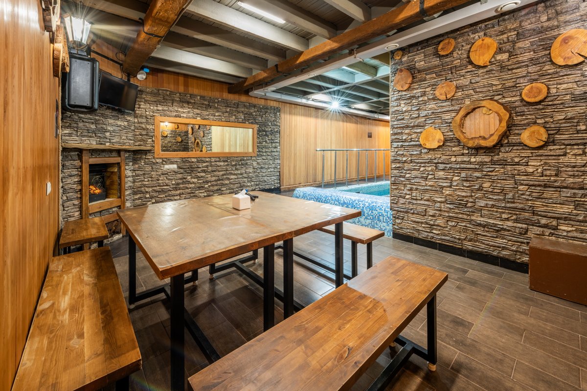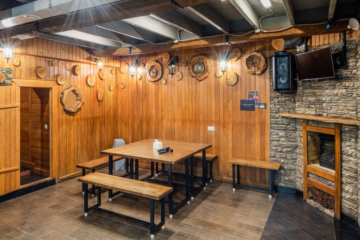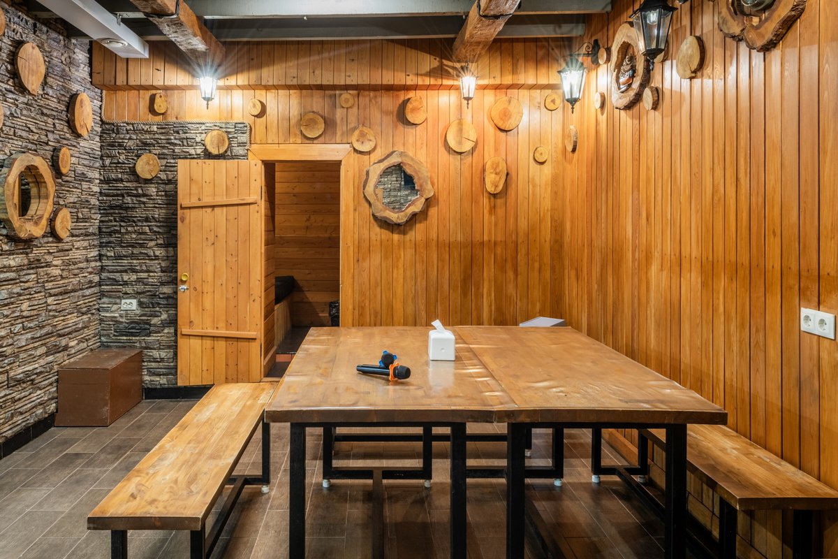 Не хочется в бассейн? Не беда! Вместо этого можно посидеть в нашей комнате отдыха. Мы постарались создать здесь комфортный, стильный интерьер из максимально натуральных, безопасных материалов, подобрать мебель, которая будет одновременно удобной и приятной глазу. Надеемся, что он придется вам по душе! Для создания настроения мы можем предложить вам бильярд, кальян и караоке. Также у нас работает бар, а если нужно, вы можете принести и собственную еду - мы не возражаем! Главное помните, что плотная трапеза незадолго перед посещением парной - это не самая хорошая идея, согласно мнению терапевтов. А вот после парной можно трапезничать смело!
